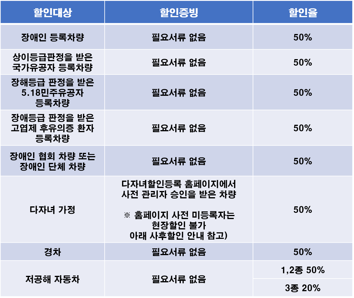 또한, 경차도 별도 필요서류 없이 50% 혜택이 주어지며 다자녀 가정은 다자녀할인 등록 홈페이지에서 승인을 받은 차량만 50%가 적용되기 때문에 사전에 사전에 행정정보에 등록하여 본인 또는 배우자가 다자녀 가구 대상임을 확인받아야 합니다. 사전에 등록하지 않았을 경우, 현장할인이 불가하여 다소 불편해도 사후할인 방법을 통해 할인을 받을 수 있습니다. 저공해 차량도 별도 서류준비 없이 1종 및 2종은 50%, 3종은 20%의 할인율을 적용받게 됩니다.