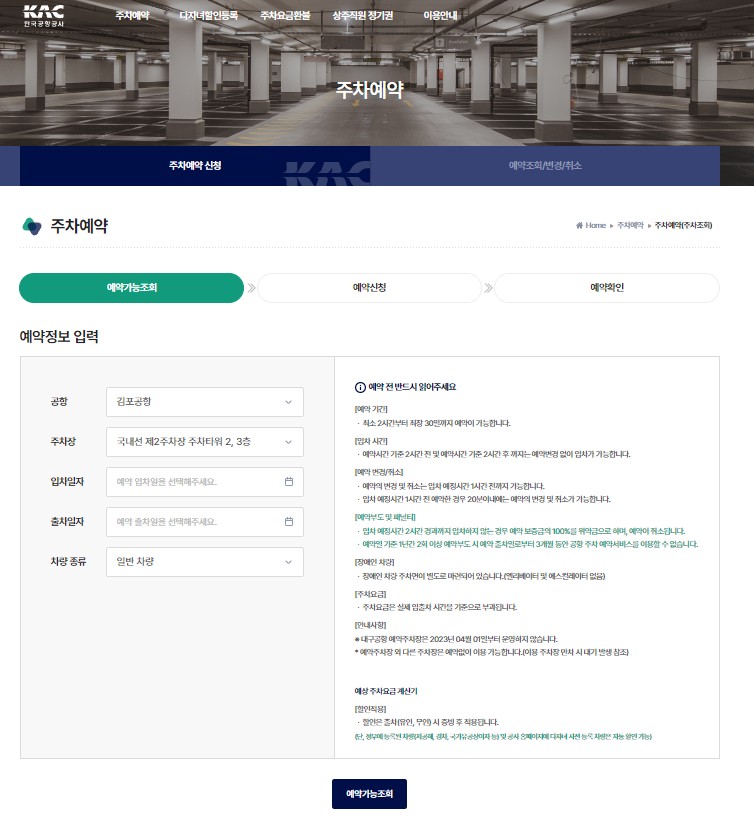김포공항은 본인 차량을 통해 공항을 이용하시는 분들의 편의를 도모하고자 미리 주차공간을 확보할 수 있는 주차예약 서비스를 제공하고 있습니다. 주차예약 서비스는 국내선 제2주차장 2, 3층에 한해서 342대까지 제공되고 있으며 주차예약 서비스를 통해 공항을 이용하시는 분은 김포공항 국내선 제2주차장으로 찾아가셔야 합니다. 단, 미니버스 및 화물차 등 대형차량과 차고 높이가 2m 이상의 차량은 이용할 수 없는 점 인지하시기 바랍니다.