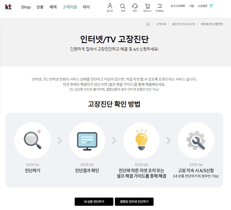 고장 진단 확인 방법으로는 총 4단계를 거치게 되는데 1단계 진단하기, 2단계 진단결과 확인, 3단계 진단에 따른 초기화 조치 또는 셀프 해결 가이드를 통해 해결, 4단계 고장 지속 시 A/S 방문신청으로 이루어져 있습니다. 단, 집전화 상품 진단은 어려우며 결합상품을 이용하시는 분의 경우, 인터넷 상품만 진단이 가능한 점에 유의하시기 바랍니다.