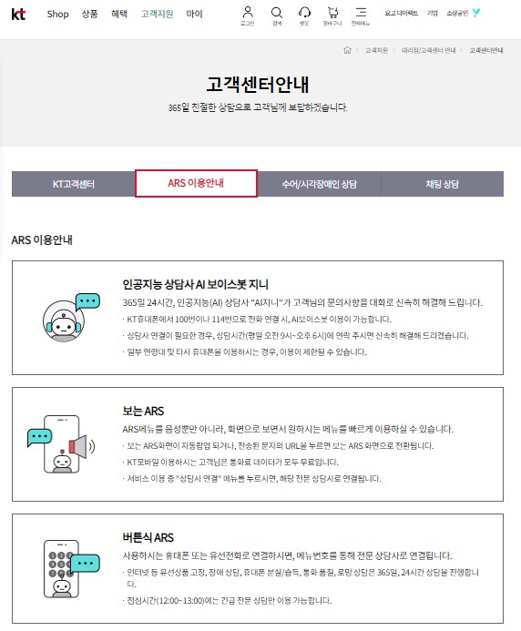 고객센터를 통한 A/S 신청에 불편함을 느끼시면 ARS를 이용한 방법으로 A/S 신청을 접수하여 진행할 수 있습니다. ARS를 이용하는 방법으로는 크게 3가지로 인공지능 상담사 AI 보이스봇 지니, 보는 ARS, 버튼식 ARS로 구분되어 있어 이용자분이 사용하시기 편한 서비스를 선택하여 이용하시면 됩니다.