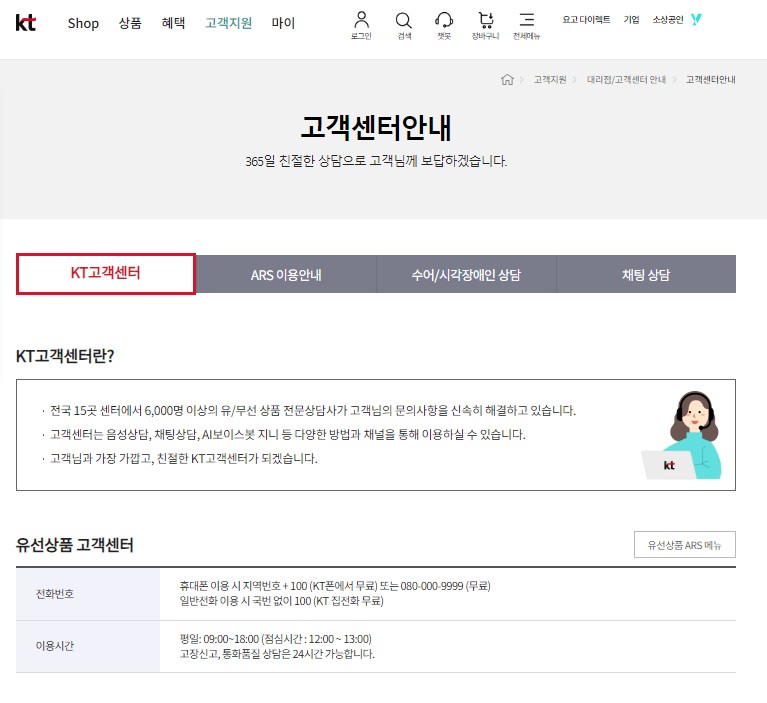 | 이용시간 | 평일 09:00 ~ 18:00 (점심시간 12:00 ~ 13:00) 고장신고, 통화품질 상담은 24시간 가능 |
