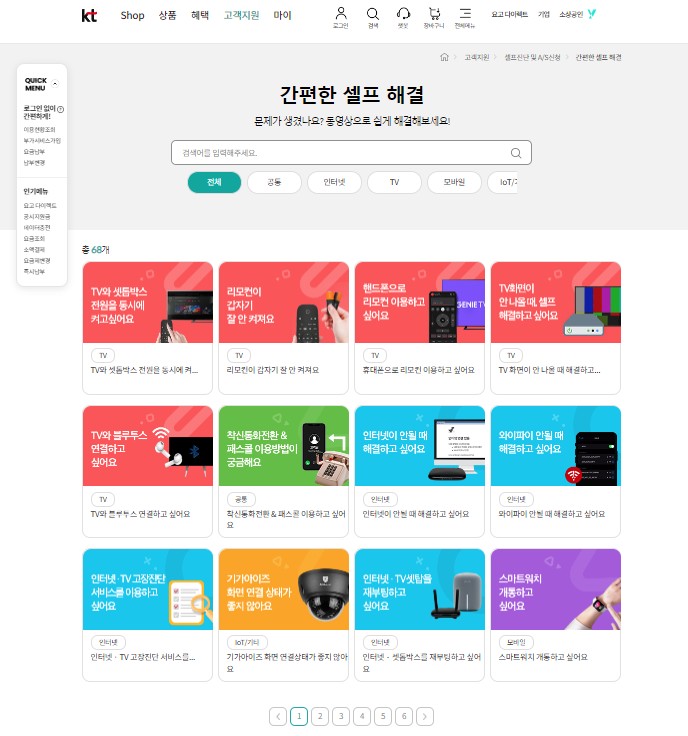 올레KT에서 제공되고 있는 상품별로 공통, 인터넷, TV, 모바일, IoT, 기타로 카테고리별로 클릭하여 확인하실 수 있고 검색어 입력란을 통해 해당 고장증상 키워드를 직접 입력하여 해당 동영상을 보다 빠르게 찾아볼 수 있는 편의도 제공하고 있습니다.