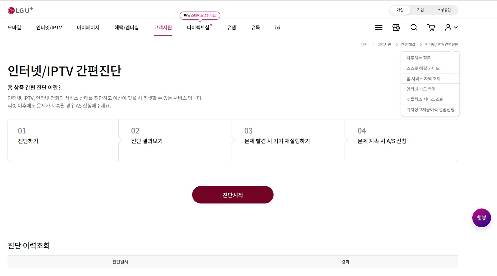LG유플러스 인터넷 및 인터넷TV 간편진단 서비스 화면
