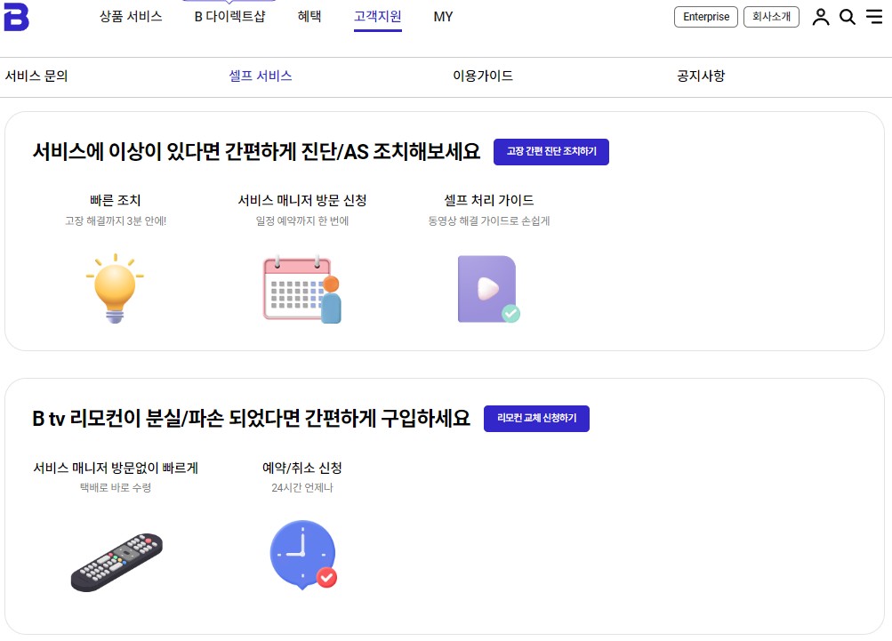 각 서비스 항목에 따라 구분되는데 빠른 조치를 통한 고장 해결까지 3분 안에 원격으로 진행되는 서비스, 일정 예약을 통한 서비스 매니저 방문 신청, 동영상 해결 가이드를 손쉽게 이용하는 셀프 처리 가이드 서비스로 나누어지게 됩니다. 각 서비스 항목은 원격상담사와의 상담을 통해 통합적으로 제공됩니다.